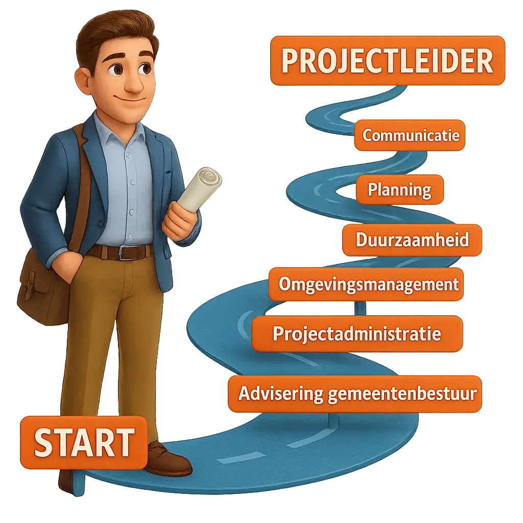 Het traject ‘Duurzaam en omgevingsbewust projectmanagement voor startende projectleiders bij gemeenten’ zorgt dat startende projectleiders zich snel ontwikkelen tot stevige, zelfstandige professionals. Dat doen we door een online leeromgeving, een uitgebreide kennisbank en persoonlijke coaching. Geen droge theorie, maar praktische handvaten en begeleiding bij de uitvoering van een eigen project.